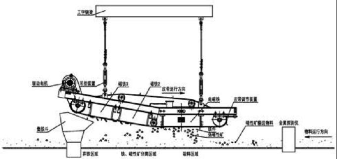 磁性矿带式电磁除铁器,采用复合磁场结构,以连续工作原理,将磁性矿中的铁件除掉。它实现了集吸铁、铁矿分离、矿石回收、弃铁于一体的功能。其工作原理如下:当输送带的金属探测仪探测到铁件通过时,金属探测仪立即发出信号给程序控制柜,则此时程序控制柜对电磁除铁器进行强励磁,当铁件到达除铁器下方则被强大的磁力吸上来,同时此时磁场较强则将一些矿石不可避免地带出来;同时带式除铁器卸料皮带连续工作,将吸取的物料搬运至弱磁场区域。在弱磁场区域由于磁性矿与铁件的磁性差异,磁性矿不被吸住而掉入输送皮带上而被回收,铁件继续被搬运至无磁区以一定的速度抛入卸铁箱中。与RCDP系列显著的区别在于此系列可连续工作,不会因除铁而引起系统生产的停止。由于除铁器与输料皮带采用水平面布置,无需RCDP的中间平台等,故占用空间少。