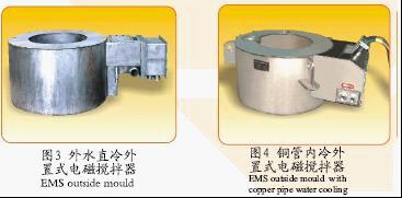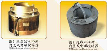 纯净水冷却内置式电磁搅拌器:电磁搅拌器安装在结晶器水腔内,电磁搅拌器单独使用一套冷却水循环系统,结构紧凑、水质好、使用寿命长,搅拌频率一般为2~8Hz(见图2)。